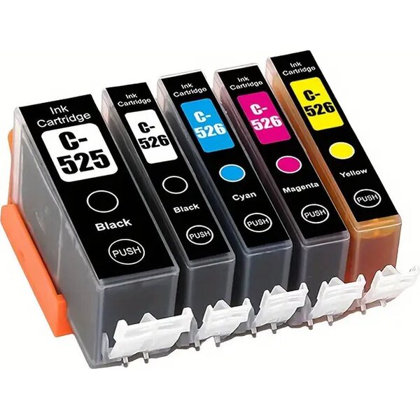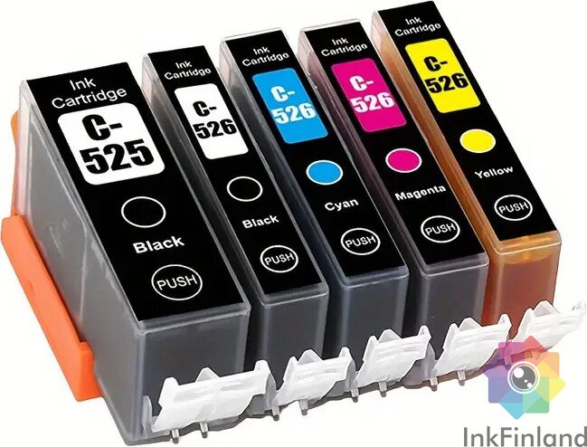 PGI-525/CLI-526 multipack, musta (PGI-525), musta (CLI-526bk), cyan, magenta, keltainen korvaavat mustepatruunat.
