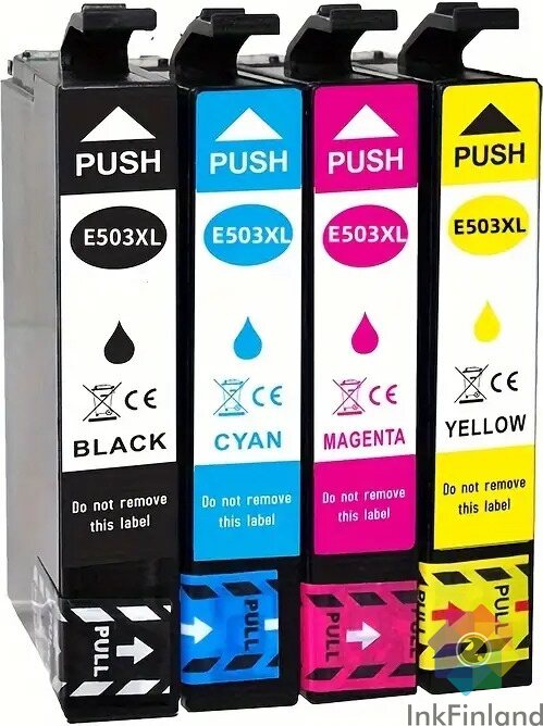 Epson 503XL multipack, musta, cyan magenta ja keltainen tarvikekasetti. Mustemäärät 18 ml (musta), 3x12 ml (värikasetit).